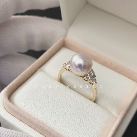 Hanadama Grade 8.5-9.0mm White Akoya Pearl Trio Diamond Ring with Certificate (Pre-order)