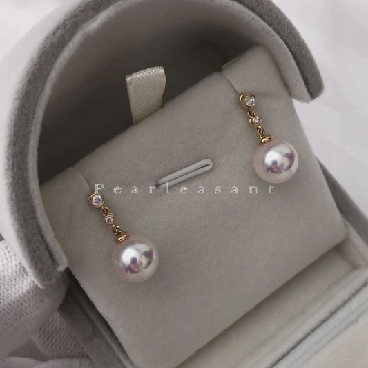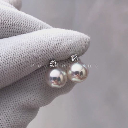 Hanadama Grade 8.0-9.0mm White Akoya Pearl Diamond Dash Earrings with Certificate