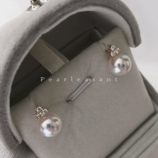 Hanadama Grade 8.5-9.0mm White Akoya Pearl Trio Diamond Earrings with Certificate