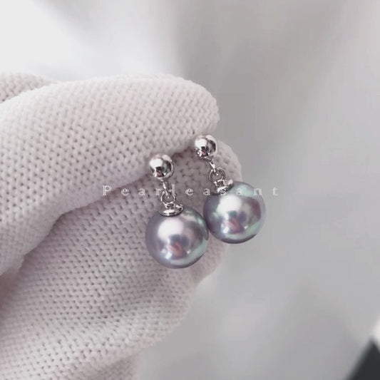 Hanadama Grade 8.5-9.0mm White Akoya Pearl Dangle Earrings with Certificate