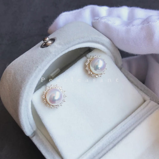 Hanadama Grade 8.5-9.0mm White Akoya Pearl Circular Sunflower Diamond Earrings with Certificate
