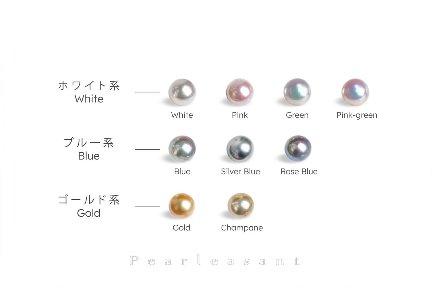 According to the grading report from Pearl Science Laboratory, Akoya pearls typically have three main color systems: ホワイト系 (White), ブル一系 (Blue) and ゴールド系 (Gold), although they can also feature a variety of overtones, like pink, green, cream, silver, etc. We listed some typical overtone and color variant examples under each color system in the left image for your reference.