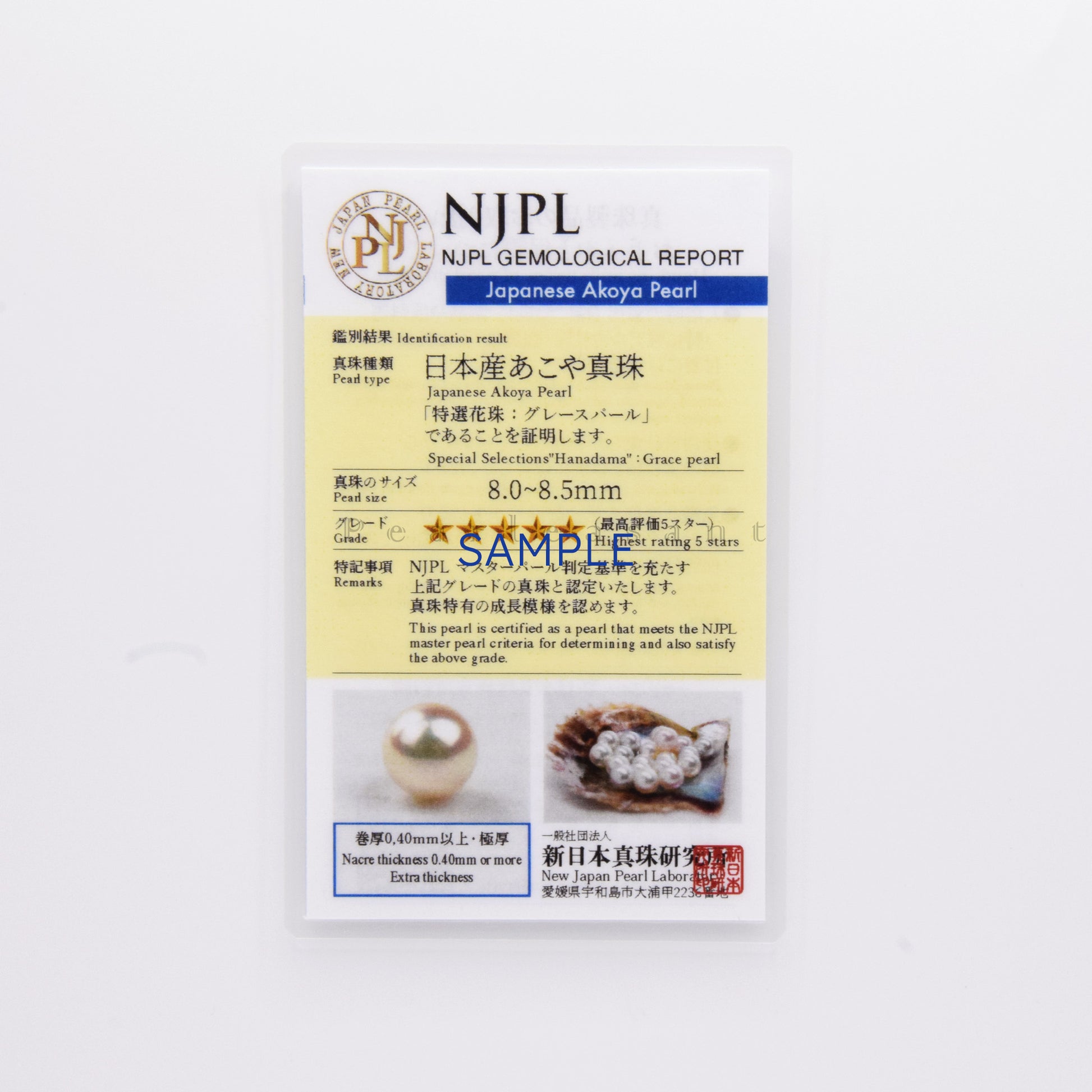 Certificate: Special selection Hanadama (特選花珠: グレースパール) certified by New Japan Pearl Laboratory