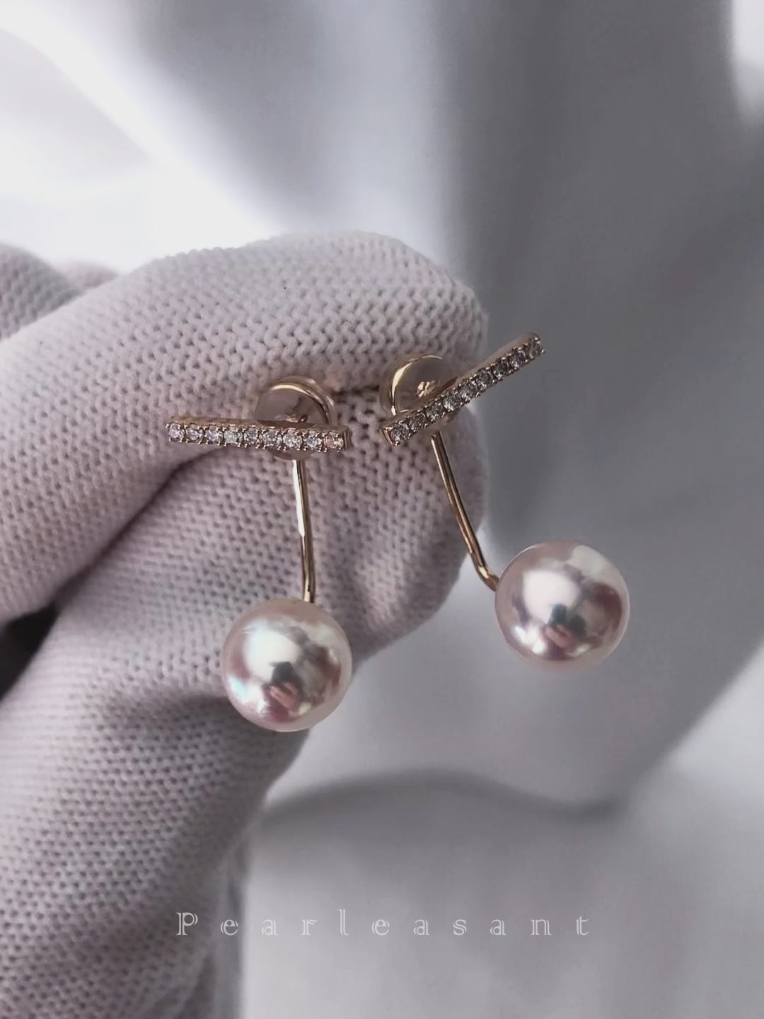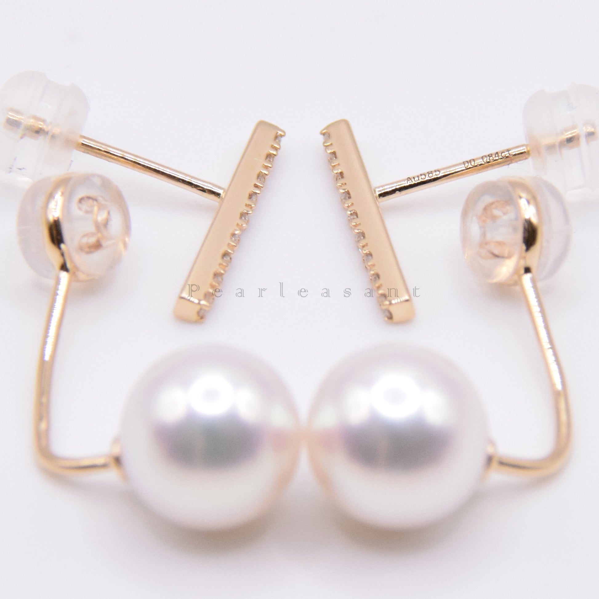 Hanadama Grade 8.0-9.0mm White Akoya Pearl Detachable Diamond Bar Earrings with Certificate