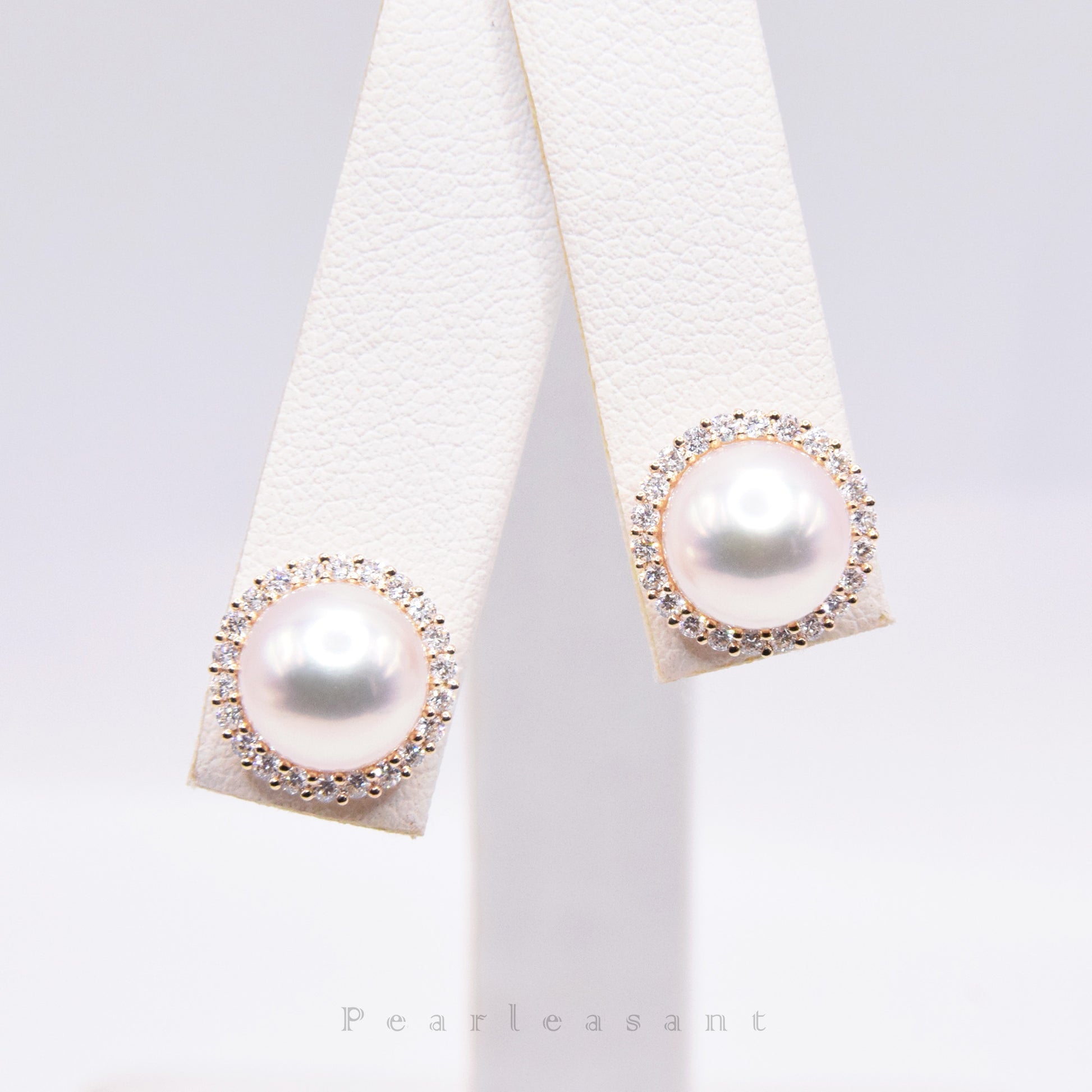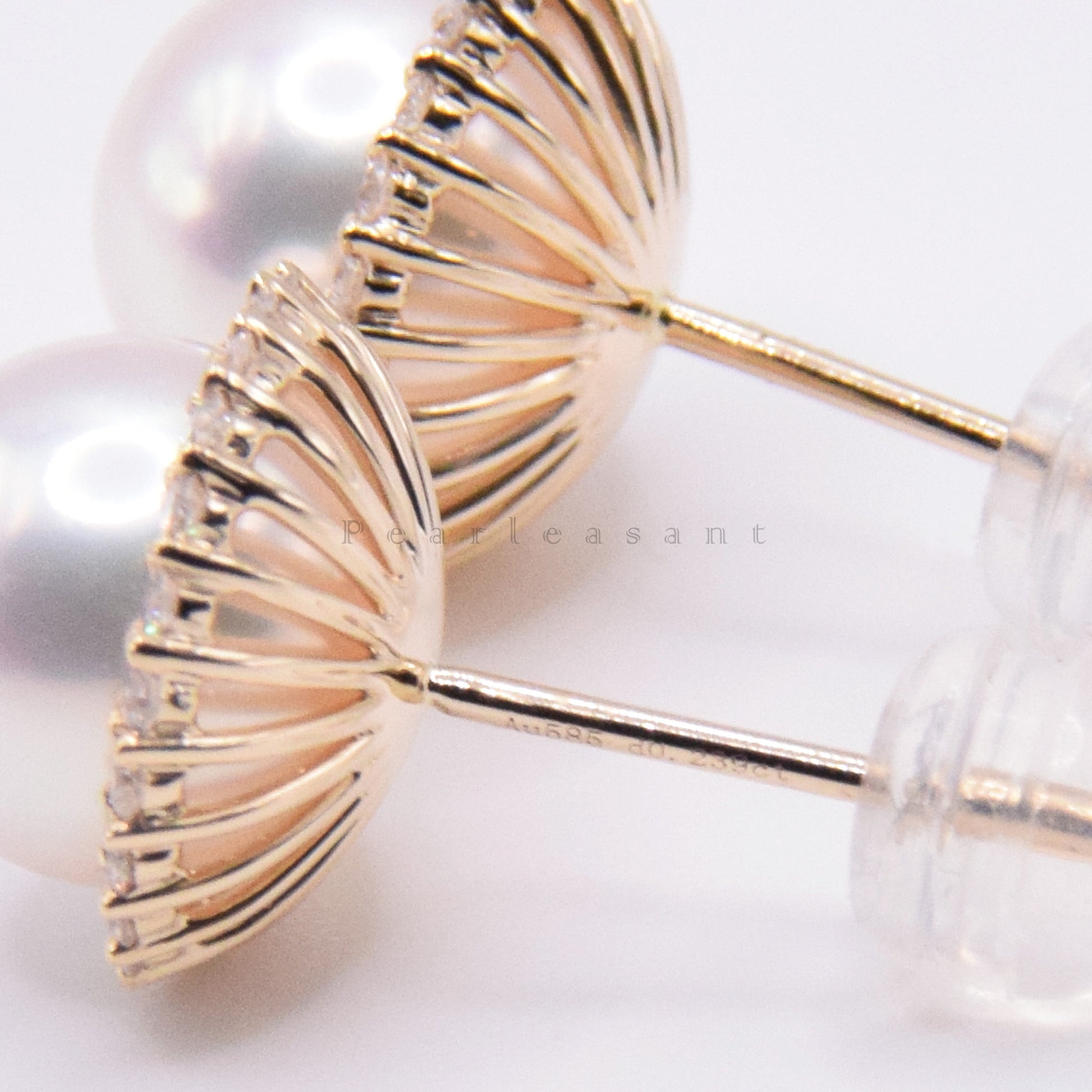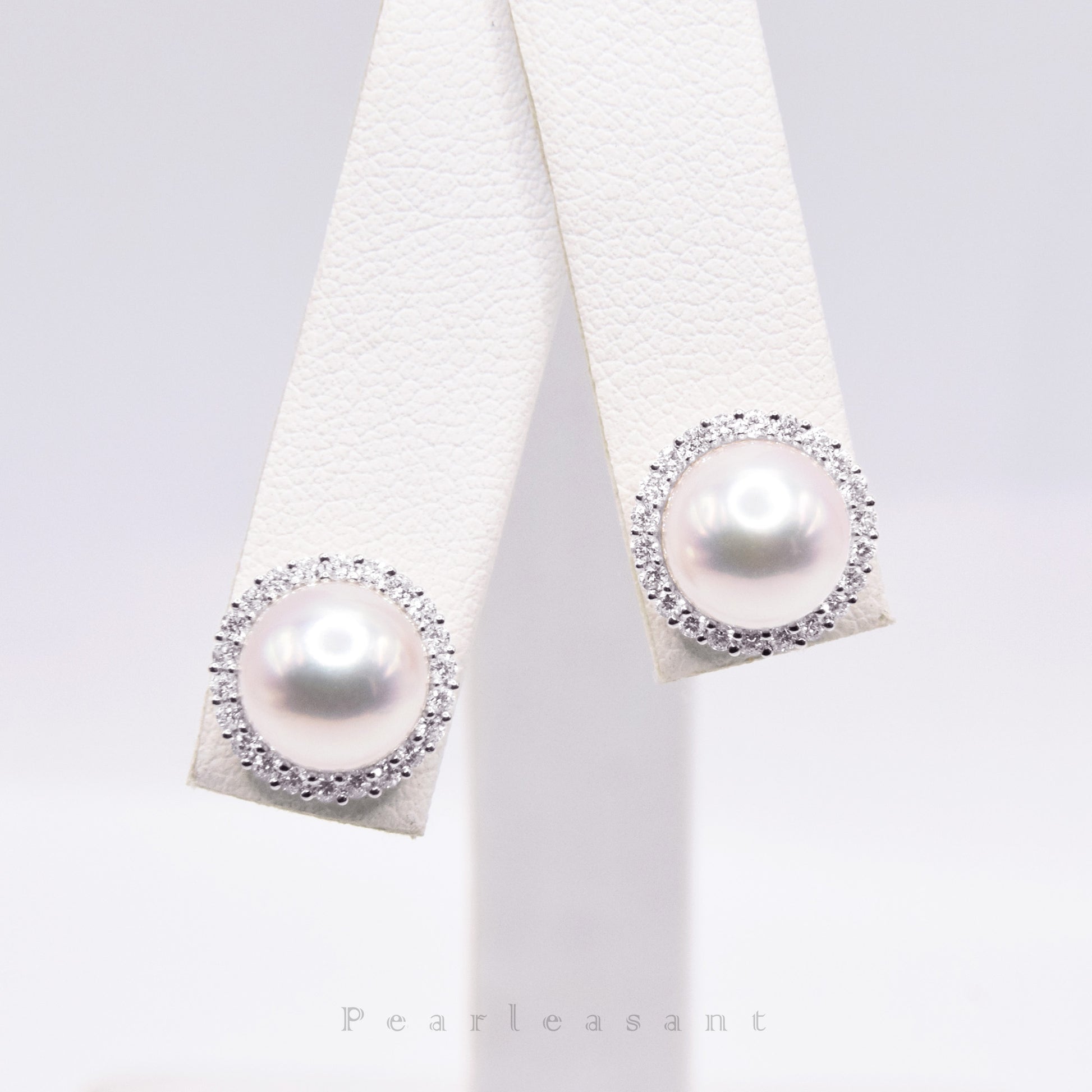 Hanadama Grade 8.5-9.0mm White Akoya Pearl Circular Sunflower Diamond Earrings with Certificate