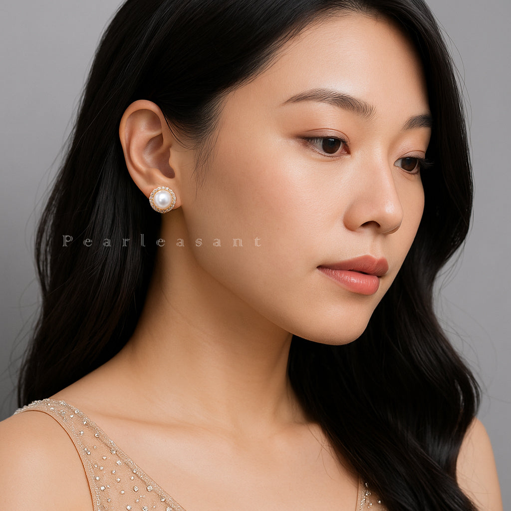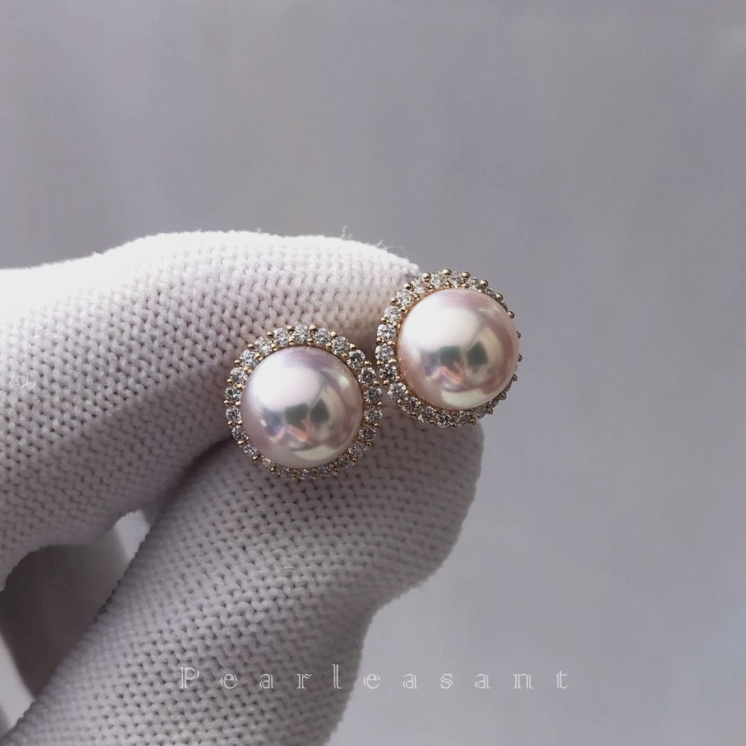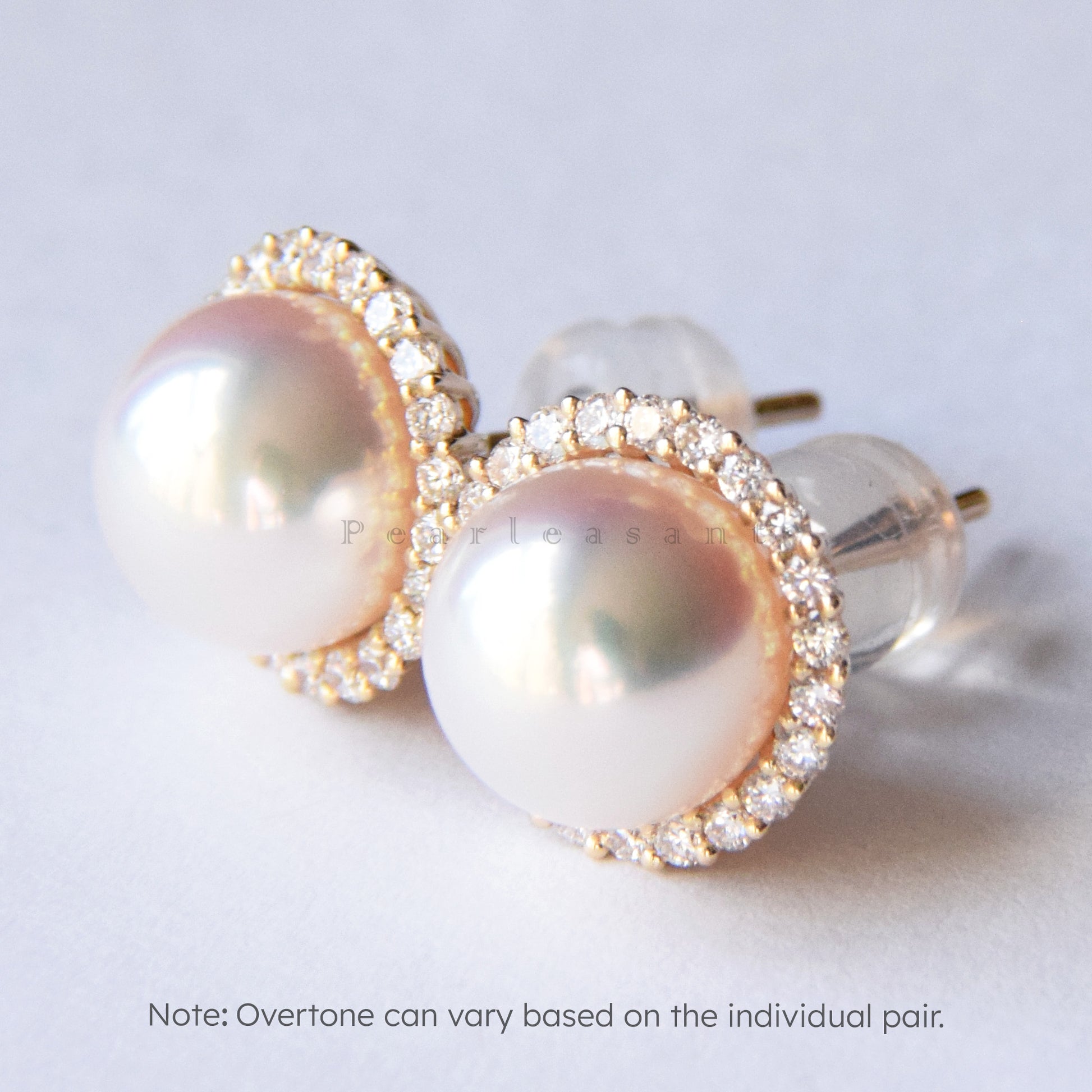 Hanadama Grade 8.5-9.0mm White Akoya Pearl Circular Sunflower Diamond Earrings with Certificate