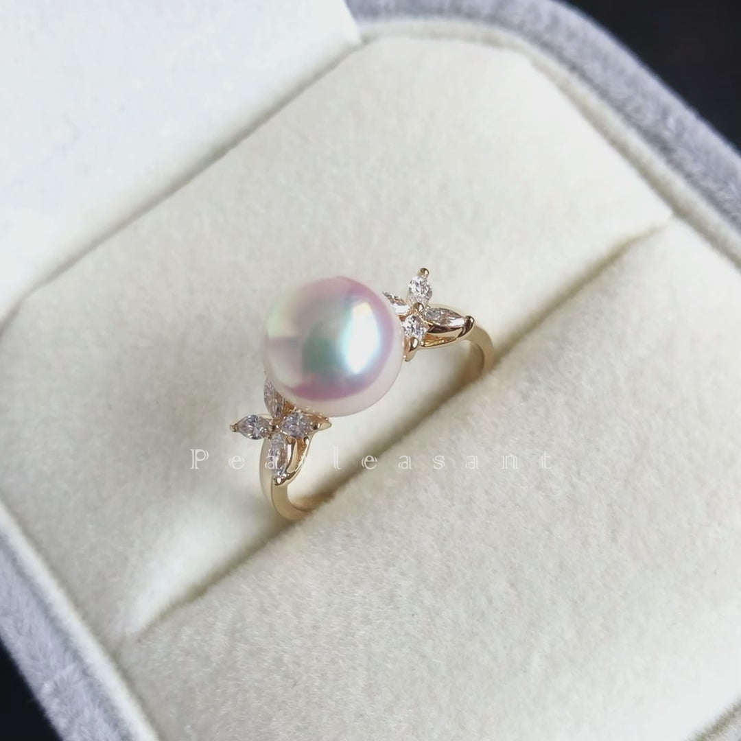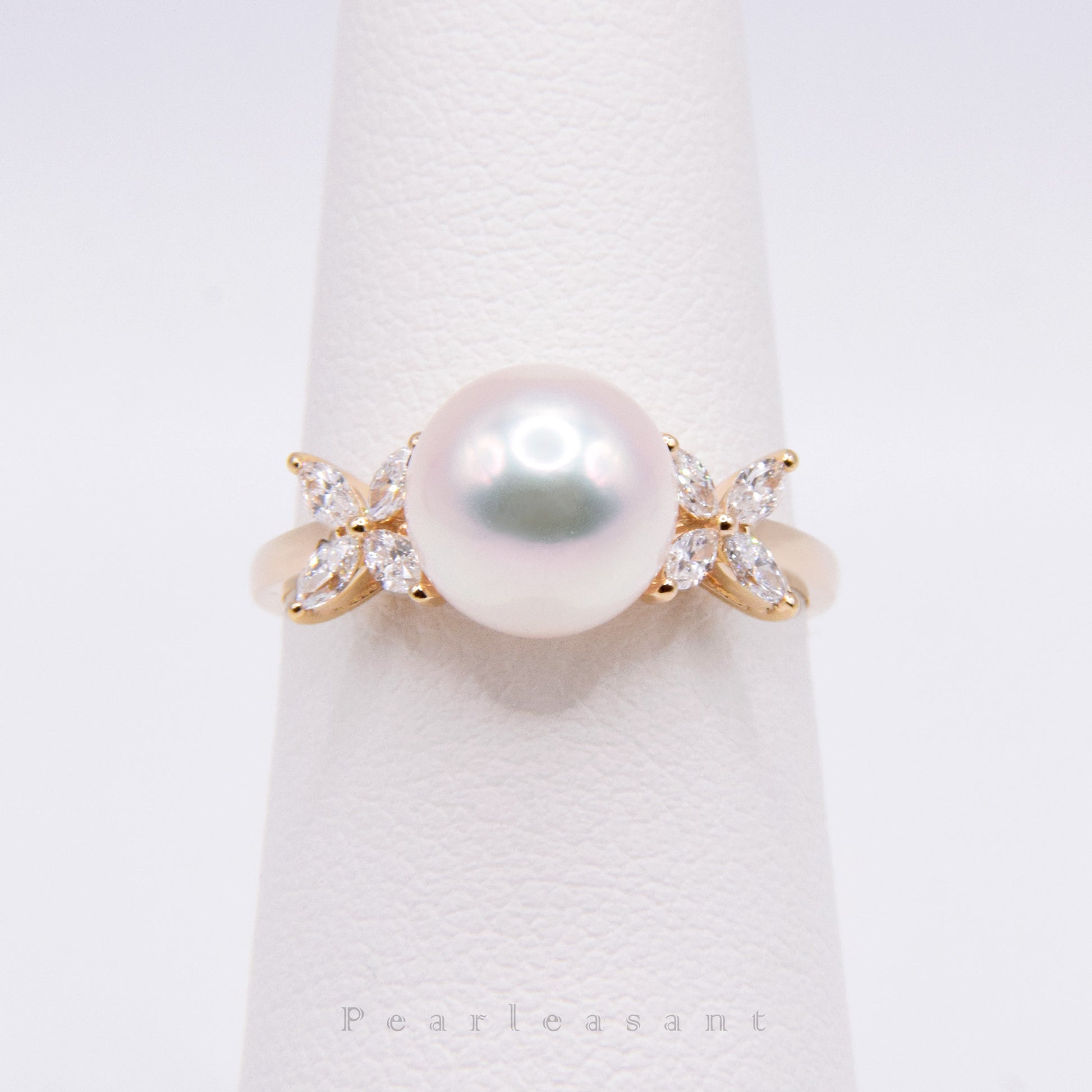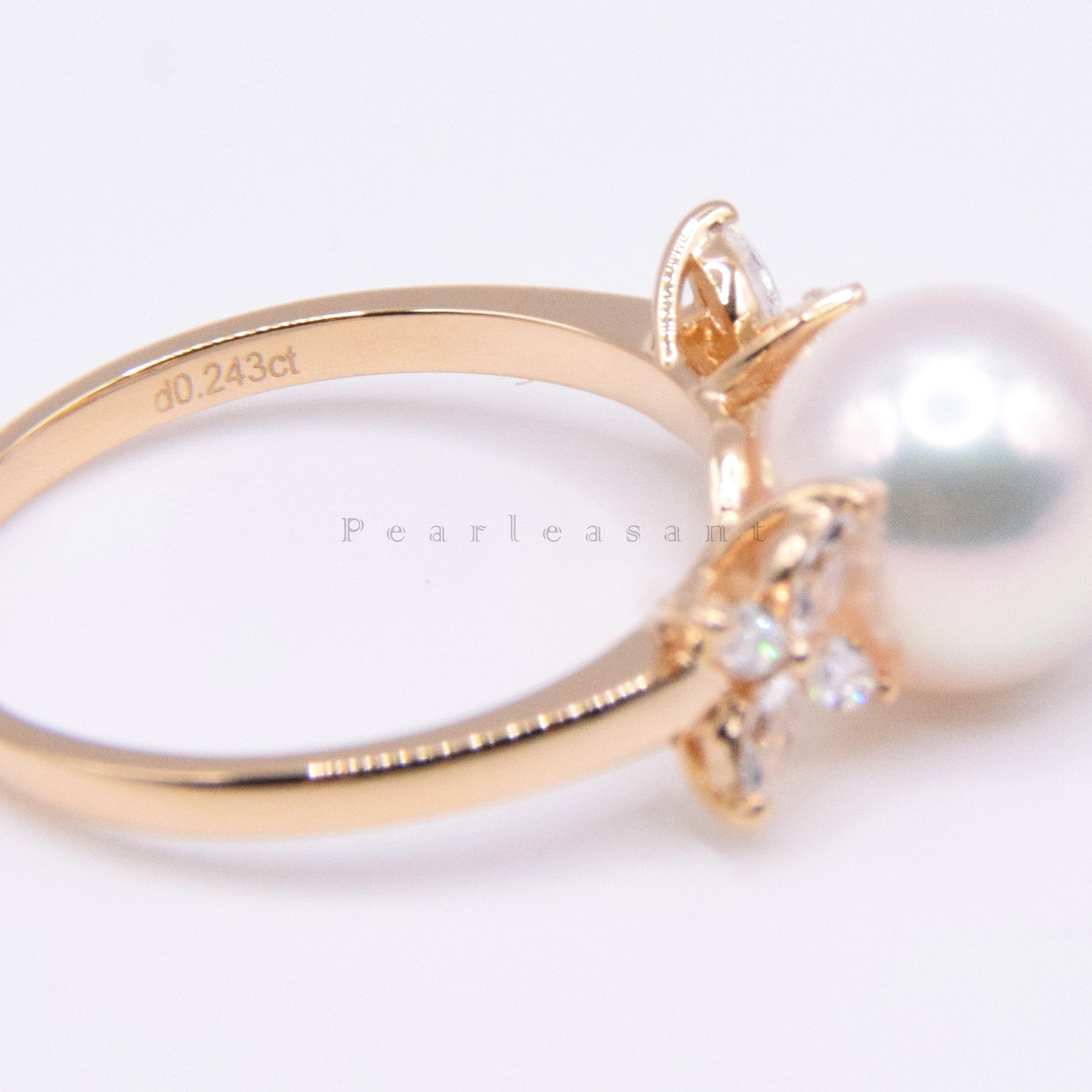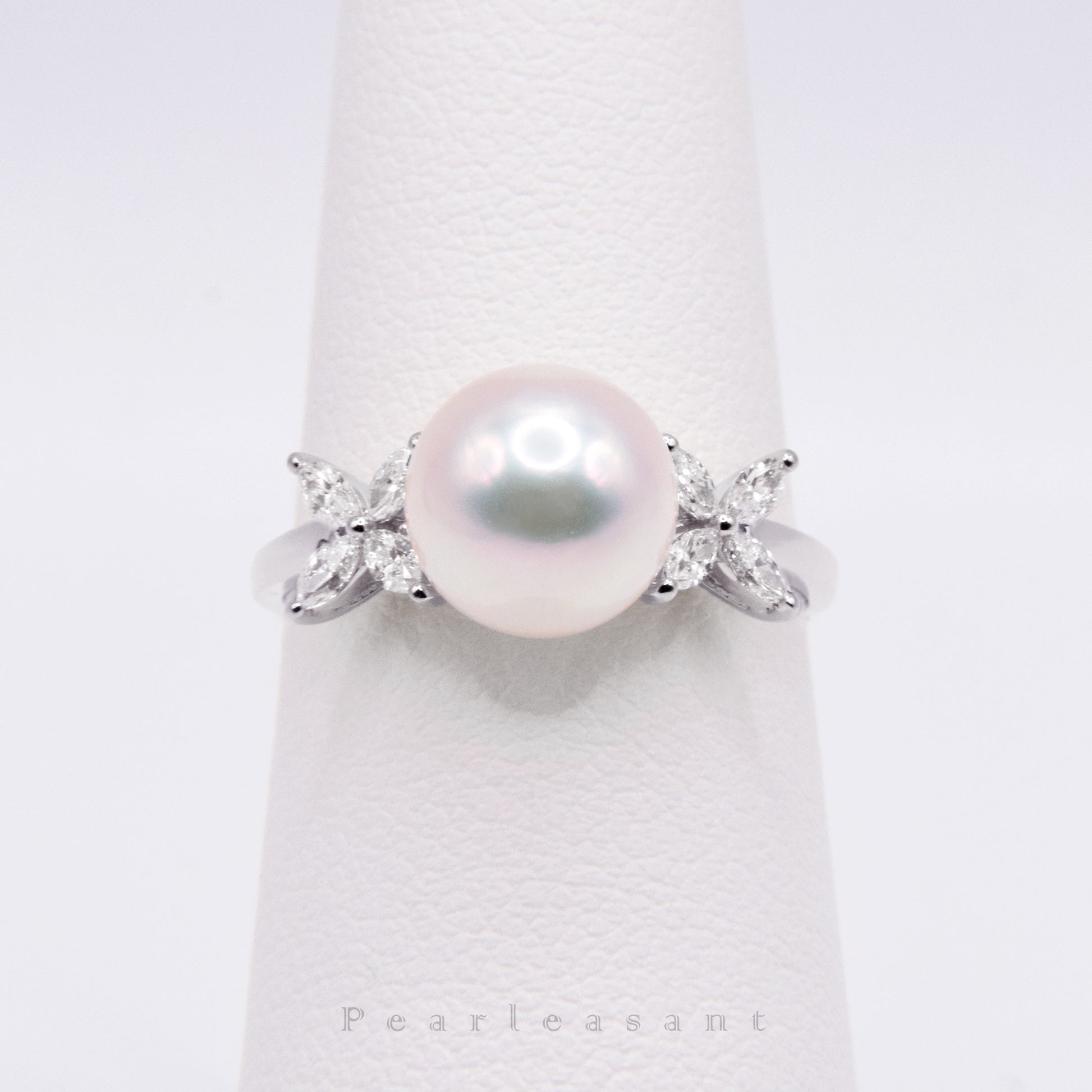 Hanadama Grade 8.5-9.0mm White Akoya Pearl Clove Diamond Ring with Certificate (Pre-order)