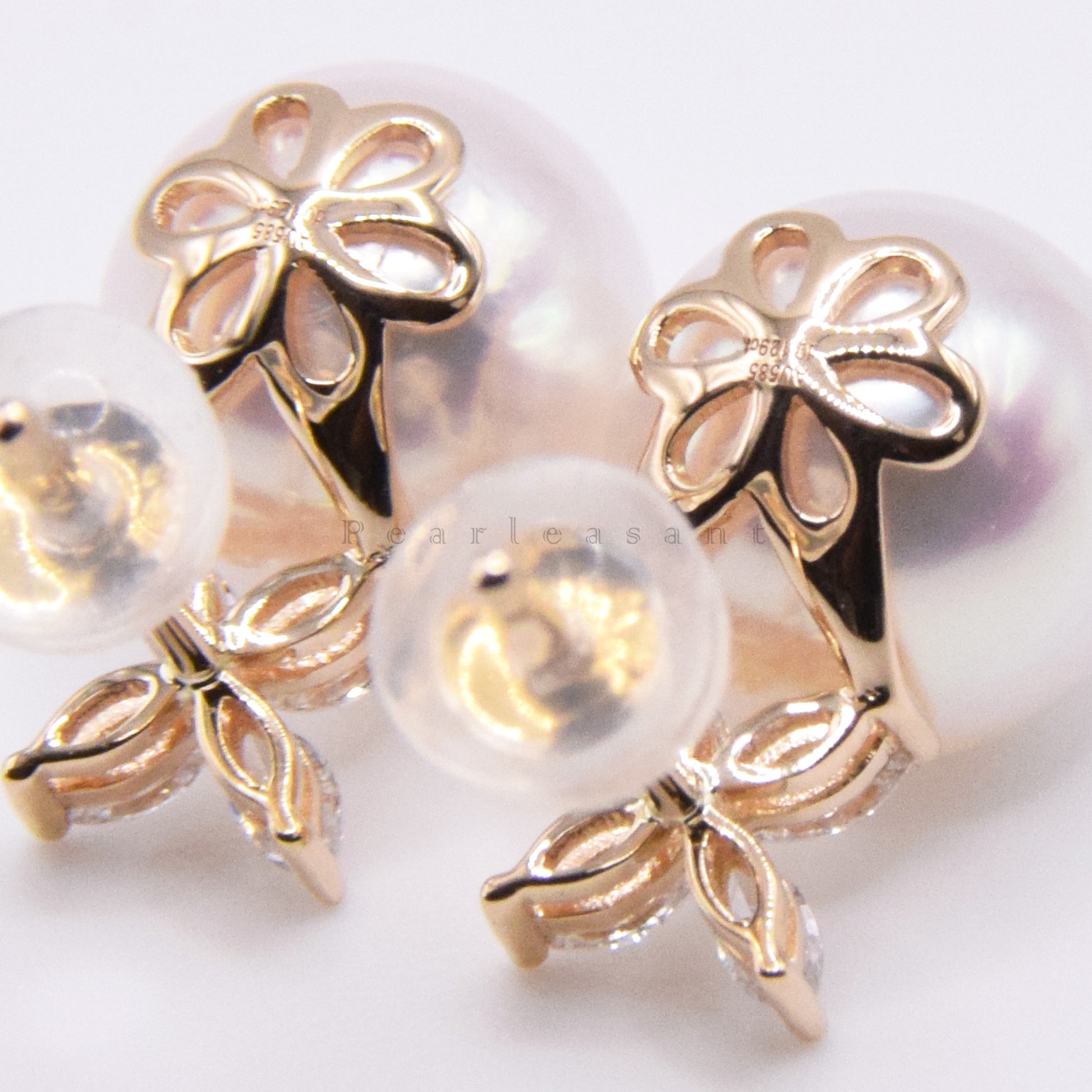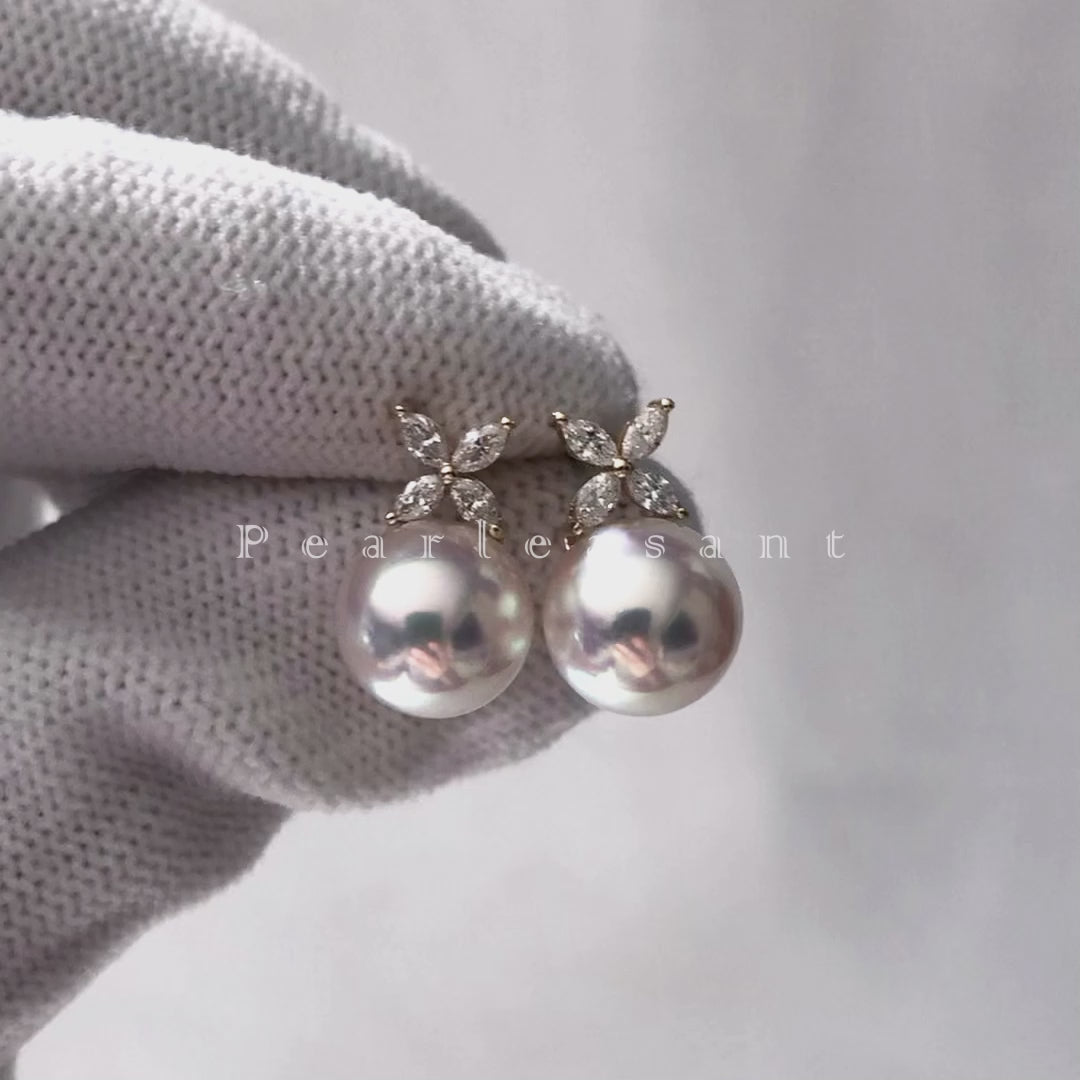 Hanadama Grade 8.5-9.0mm White Akoya Pearl Marquise Diamond Clove Earrings with Certificate