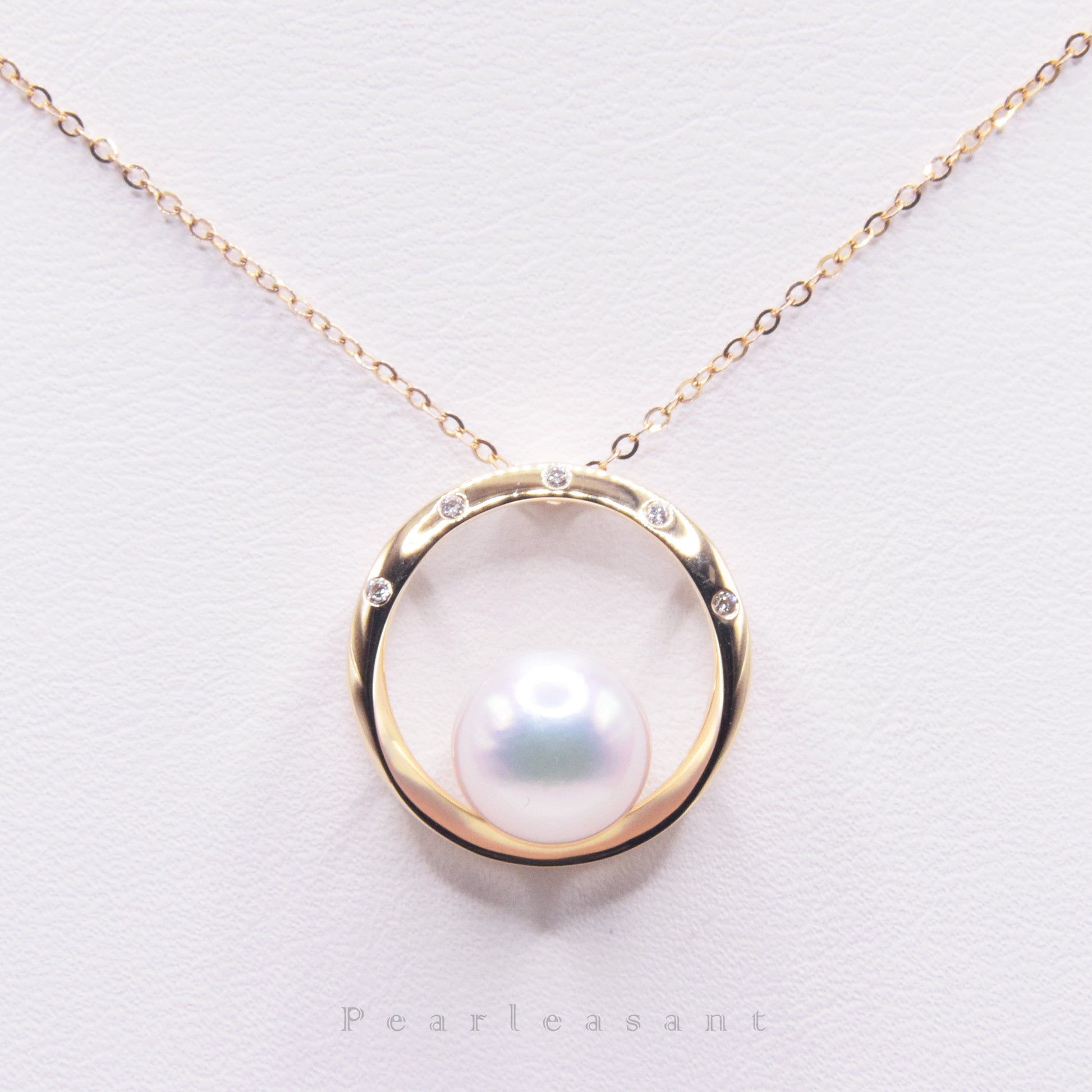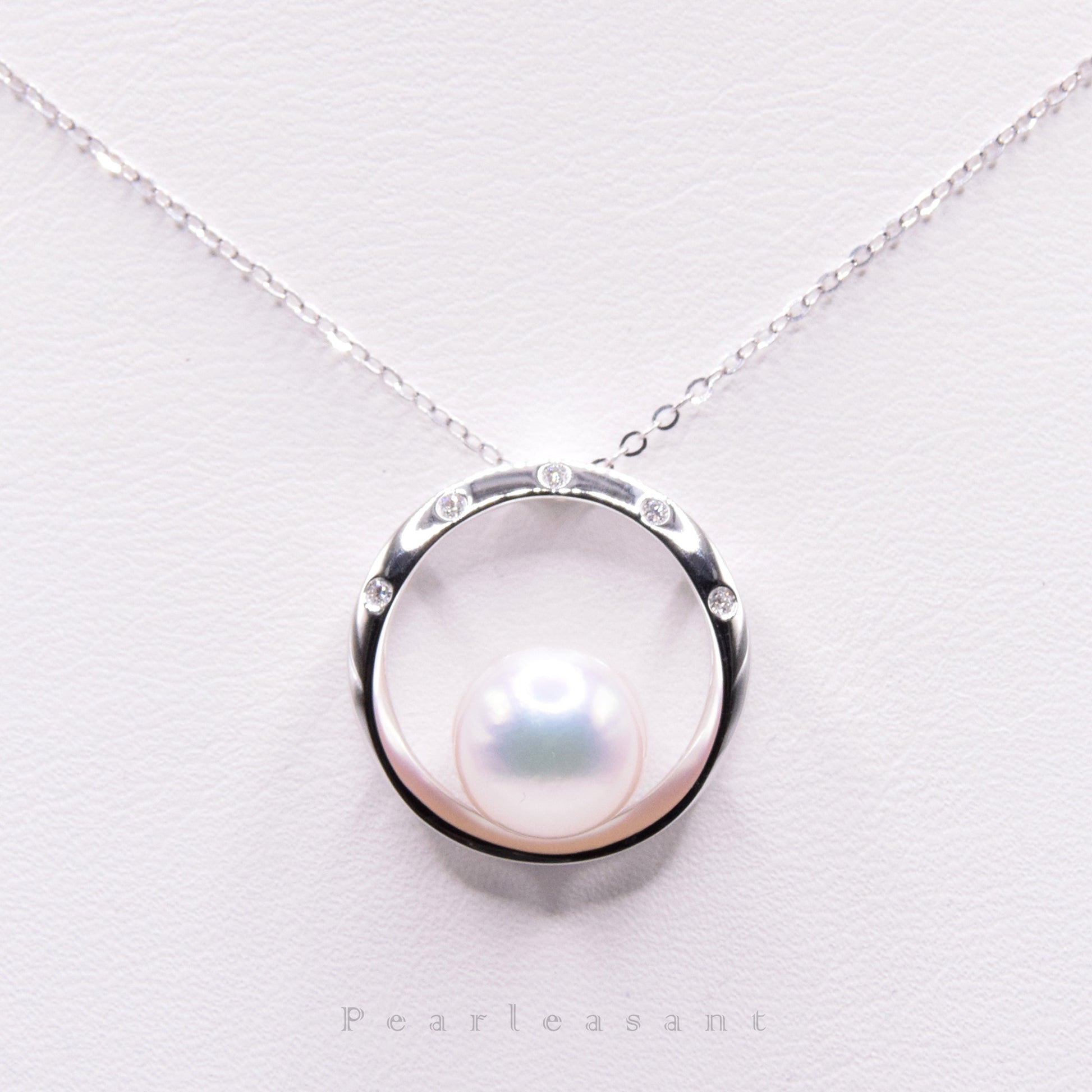 Hanadama Grade 8.5-9.0mm White Akoya Pearl Circle Diamond Pendant with Certificate