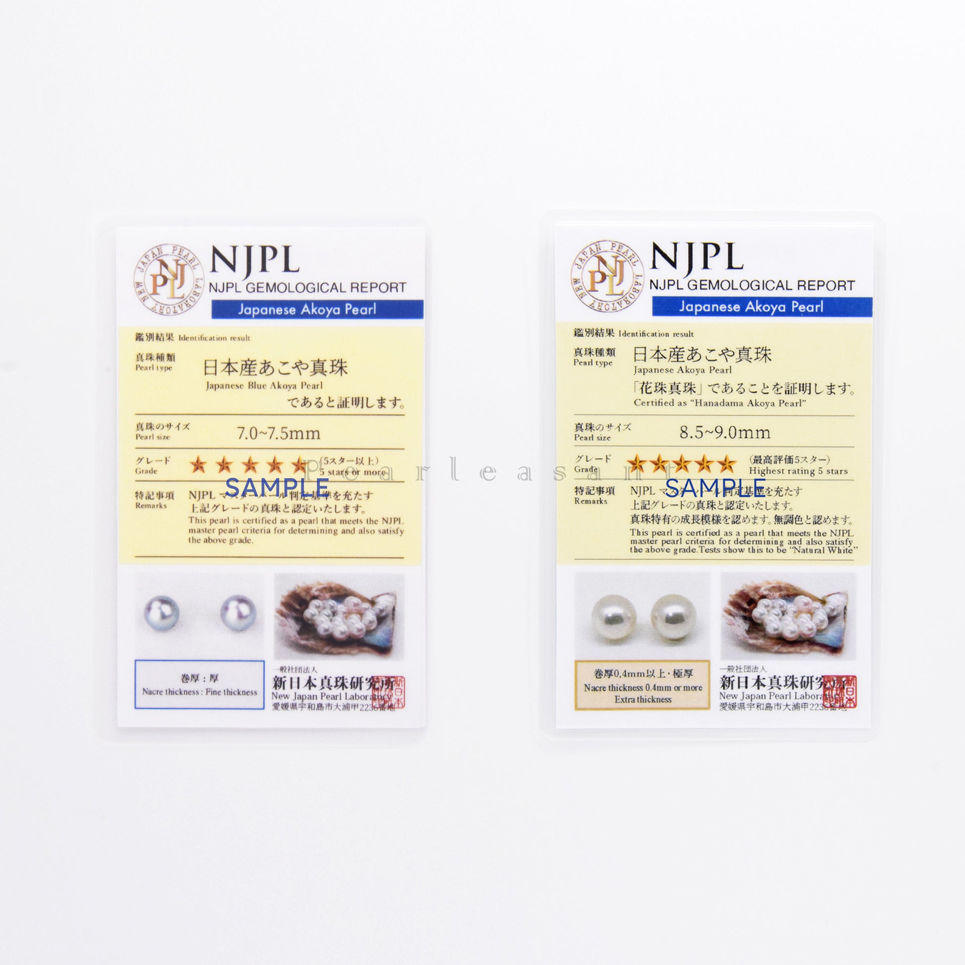 Certificate: 5-star grade Japanese Blue Akoya Pearl & 5-star Hanadama (花珠真珠) natural white (無調色) certified by New Japan Pearl Laboratory