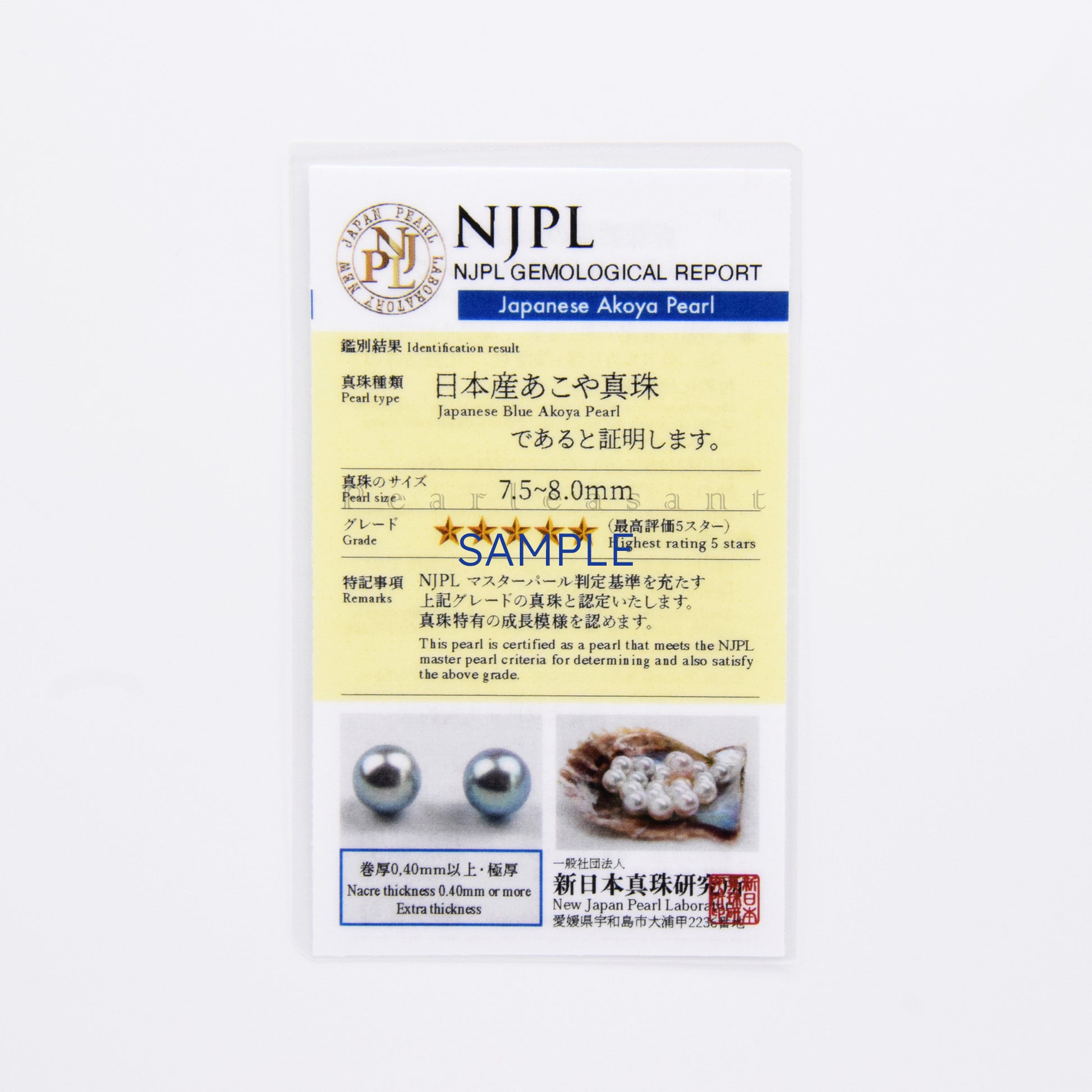 Certificate: 5-star grade Japanese Blue Akoya Pearl certified by New Japan Pearl Laboratory